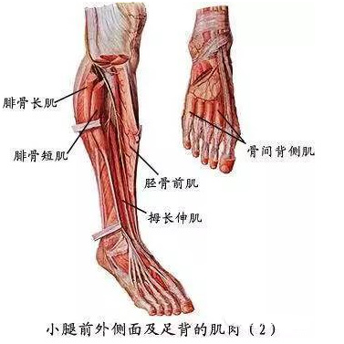 足肌:足肌分为足背肌和足底肌。足背肌包括母短伸肌和趾短伸肌,助伸趾。足底肌的配布和作用与手肌相似,也可分为内侧群、外侧群和中间群,但缺乏对掌肌。另外还有趾短屈肌和足底方肌,有屈足趾和维持足弓的作用。
