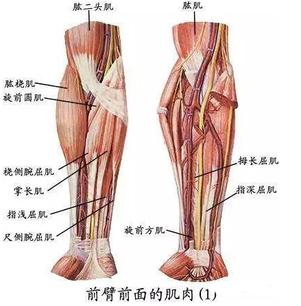 前臂肌前群:前臂肌前群共9块,分浅、深两层。浅层有6块,从桡侧向尺侧依次为肱桡肌、旋前圆肌、桡侧腕屈肌、掌长肌、指浅屈肌和尺侧腕屈肌。深层有3块,即拇长屈肌、指深屈肌、旋前方肌。