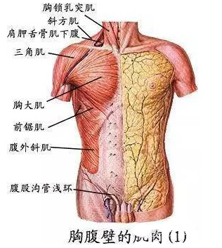 胸大肌、腹外斜肌:胸大肌起自锁骨、胸骨和上6个肋软骨,肌束向外上集中,止于肱骨大结节下方。收缩时可使肩关节内收、旋内和前屈。当上肢固定时,可上提躯干,并协助吸气。腹外斜肌起自下位8个肋骨的外面,肌束斜向前下,近腹直肌的外侧移行为腱膜,经腹直肌的前面,参与构成腹直肌鞘的前层,止于腹前壁正中的白线。腹外斜肌腱膜下缘增厚卷曲,张于髂前上棘和耻骨结节之间,称为腹股沟韧带。