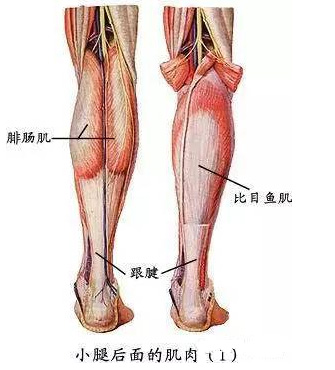 小腿肌后群浅层:浅层有腓肠肌和比目鱼肌两肌合称为小腿三头肌。腓肠肌以内、外侧头分别起自股骨内、外上髁;深面的比目鱼肌起自胫、腓骨上端的后面,二肌约在小腿中部移行为粗大的跟腱,止于跟骨结节。小腿三头肌可跖屈踝关节,屈小腿和上提足跟。站立时,能固定踝关节和膝关节,以防止身体前倾。