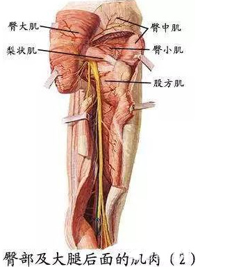 臀中肌、臀小肌和梨状肌:臀中肌位于臀大肌的深面,臀小肌位于臀中肌的深面,二肌均起于髂骨翼外面,止于股骨大转子。两肌共同使髋关节外展。梨状肌起自骶骨的前面,向外经坐骨大孔出骨盆入臀部,止于股骨大转子的顶部。可使髋关节外展和外旋。坐骨大孔被梨状肌分隔为梨状肌上孔和梨状肌下孔,孔内有血管、神经通过。