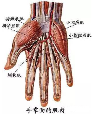 手肌:手肌全部位于手的掌侧面,主要运动手指,分外侧群、内侧群和中间群。外侧群称大鱼际。内侧群称小鱼际。中间群位于掌心和掌骨之间,包括4块蚓状肌和7块骨间肌。