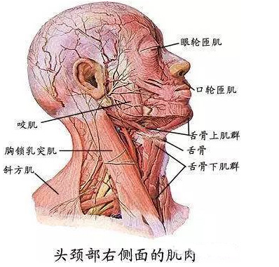 颈肌:颈肌依其所在的位置分为颈浅肌群、舌骨肌群和颈深肌群。胸锁乳突肌位于颈部的两侧,大部分被颈阔肌所覆盖,起自胸骨柄和锁骨的胸骨端,二头会合斜向后上方,止于颞骨的乳突。胸锁乳突肌的作用是:一侧胸锁乳突肌收缩使头屈向同侧,面部转向对侧;两侧同时收缩可使头后仰。